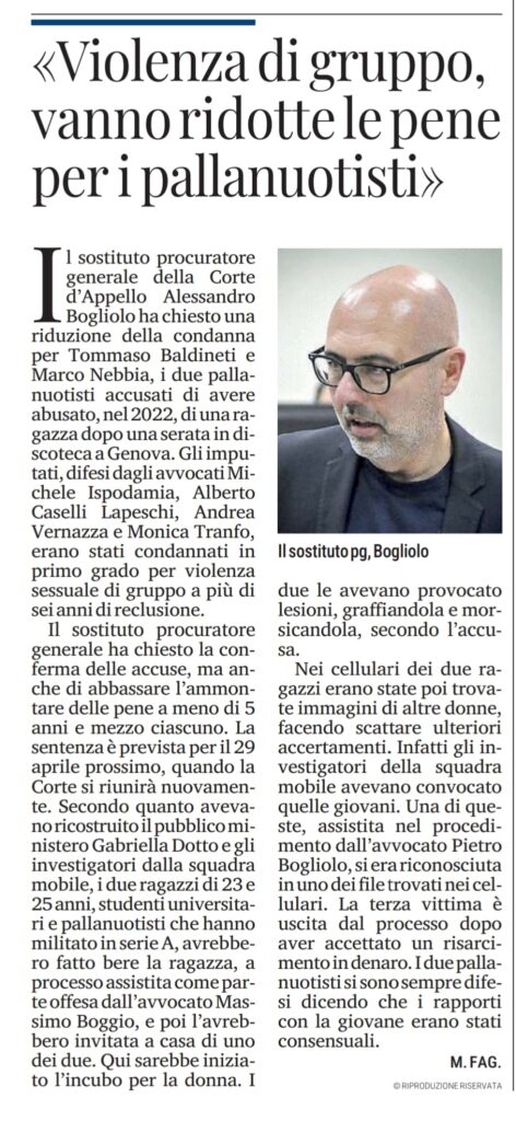 - “Violenza di gruppo, vanno ridotte le pene per i pallanuotisti”